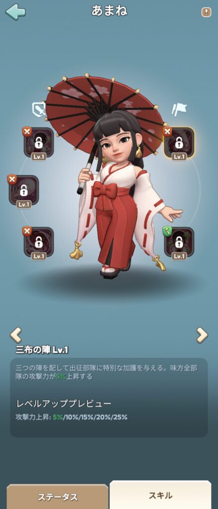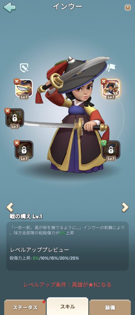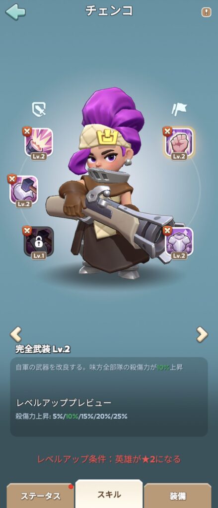 またSSR以外の英雄は遠征スキルの構成が異なるため、特に画面右上のスキルレベルを上げるようにすることで火力が出せる。